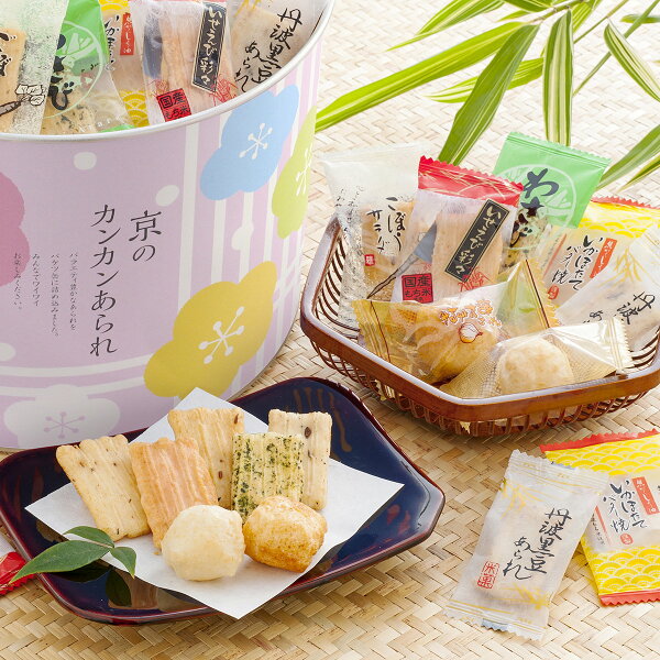 感謝のメッセージが入ったかわいいバケツ缶に、食べやすい一口サイズのあられを詰めました。