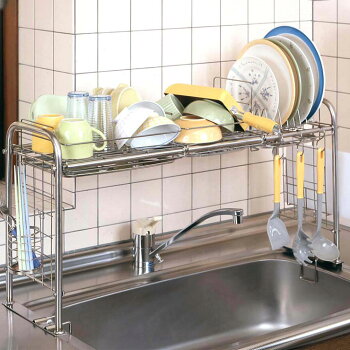 ●商品サイズ:幅110×奥行24.5×高さ42.5cm 4500g●材質:本体=ステンレス、箸立て底部=銅、脚裏=ゴム●原産国:日本●組立品●耐荷重:上部=20kg●本体幅64〜110cmの伸縮式●水切りバスケット(大・小)、皿立て、水切りトレー(大:1枚 小:2枚)、まな板立て、箸立て●シンク上の空きスペースを有効利用!調理の作業スペースの確保、洗い物等の動作もスムーズに!本体はさびにくいステンレス製で、いつまでも清潔。
