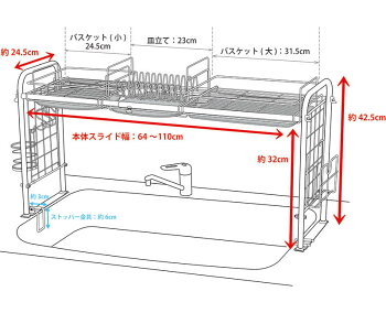 シンク収納ラック 水切りラック 幅64~110cm 伸縮式 スライド式 奥行24.5cm 高さ42.5cm 耐荷重:上部20kg ステンレス 錆びにくい(代引不可)【送料無料】